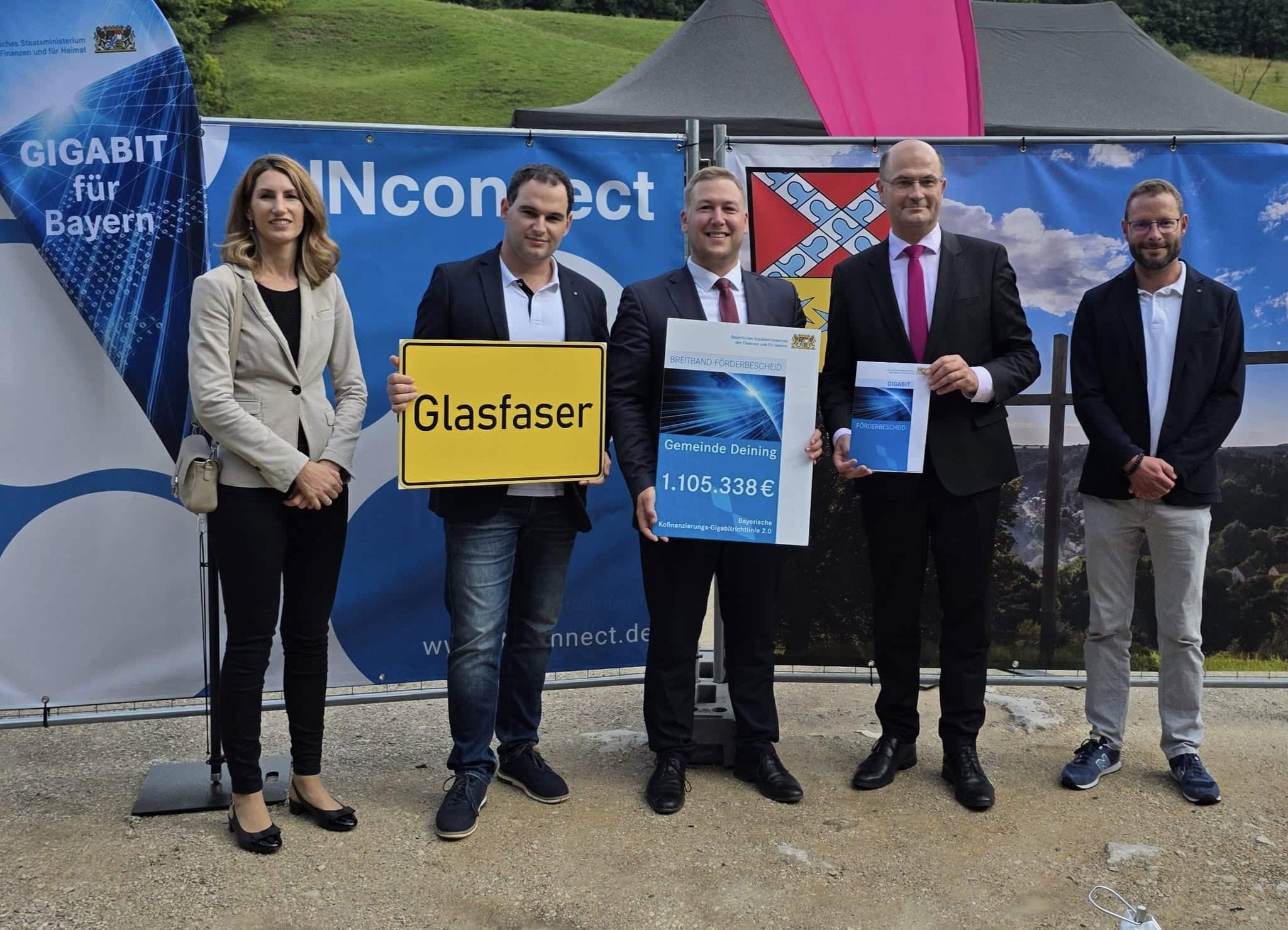 Im Beisein von Finanzminister Albert Füracker, sowie dem Konzernbevollmächtigten der Deutschen Telekom, Jürgen Lück, konnte nun der Spatenstich für den eigenwirtschaftlichen Glasfaserausbau für den Ort Deining und somit für immerhin 870 Adressen erfolgen. Gleichzeitig übergab Finanzminister Albert Füracker einen Förderbescheid in Höhe von 1,1 Mio. Euro, mit dem der Glasfaserausbau für alle noch nicht erschlossenen Adressen in der Gemeinde abgesichert wird. Auch Vertreter der Firma Glasfaserplus und der Baufirma INconnect sowie Geschäftsleiter Martin Meyer und Bauamtsleiter Johannes Gabriel von der Gemeindeverwaltung waren beim Spatenstich dabei. „Gerade im ländlichen Raum ist es besonders wichtig, sich als Gemeinde auf die Zukunft auszurichten und modern weiter zu entwickeln. Glasfaser bedeutet für unsere Mitbürgerinnen und Mitbürger schnelles und stabiles Internet“, betonte Bürgermeister Peter Meier in seinen Grußworten. Auch Finanzminister Albert Füracker ging in seiner Begrüßung auf die Bedeutung des Glasfaserausbaus ein. „In Bayern setzen wir auf eine zukunftsfähige digitale Infrastruktur. Für die flächendeckende Versorgung Gigabitversorgung im gesamten Freistaat ist die Gemeinde Deining ein herausragendes Beispiel“, freute sich Finanzminister Albert Füracker. So betonte er auch, dass sich der Freistaat Bayern seit Jahren massiv engagiere, um eine optimale Versorgung gerade auch in ländlichen Gebieten sicherzustellen. Bürgermeister Peter Meier und Finanzminister Albert Füracker bedankten sich gleichzeitig auch bei GlasfaserPlus und allen Beteiligten für ihr Engagement. Der Konzernbeauftragte der Deutschen Telekom, Jürgen Lück, erklärte, dass die Hausanschlüsse im eigenwirtschaftlich finanzierten Ausbaugebiet währende der Ausbauphase durch GlasfaserPlus kostenfrei erfolgt, wenn gleichzeitig ein entsprechender Tarif bei einem Telekommunikationsanbieter gebucht werde. Zum Abschluss erinnerte Bürgermeister Peter Meier daran, dass alle Weiler und Höfe in der Gemeinde sowie 600 Adressen in den Ortsteilen schon für Glasfaser ausgebaut seien. Gleichzeitig hob er nochmal hervor, dass mit diesem Ausbau eine große und sehr wichtige Infrastrukturmaßnahme für alle Bürgerinnen und Bürger der Gemeinde gewährleistet wird.